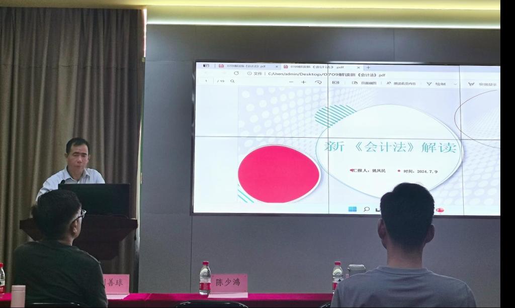 为积极响应国家法治建设号召,深入贯彻新修订的《中华人民共和国会计法》与《公司法》精神,2024年7月9日,会计学院组织全体教师专题学习新《会计法》与新《公司法》,由会计学院院长姚凤民教授和副院长刘善球教授分别解读新《会计法》和新《公司法》的影响和意义,本次专题学习会由会计学院院长助理陈蒙梦主持。