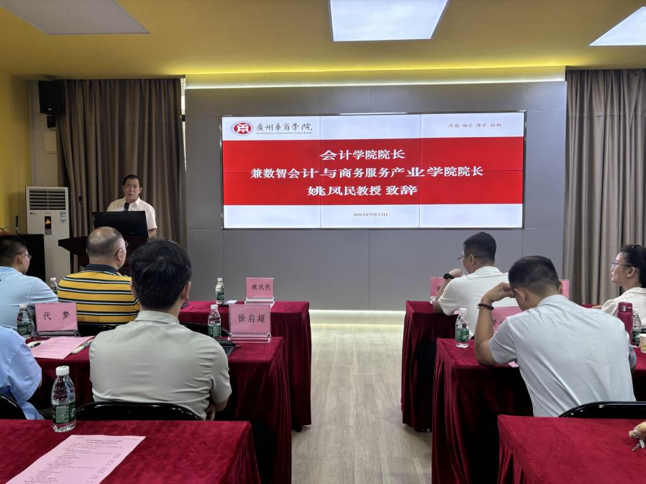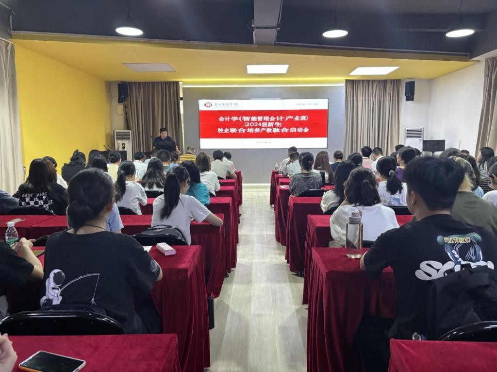 2024年9月13日,yabo鸭脖官网会计学(智能管理会计产业班)2024级校企联合培养产教融合启动会在会计学院会议厅举行,与会计学院产业学院联合培养人才的用友新道科技股份有限公司、广州恒惟信科技集团有限公司、金蝶精一科技服务有限公司、广东翰智数字科技有限公司、零禾一智能(深圳)有限公司、湛江市明灯文化科技有限公司的企业代表,学校教务处副处长黄静萍老师、会计学院院领导、产业学院院领导等出席典礼。典礼由会计学院副院长周书域老师主持。