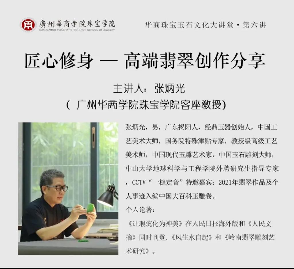 2024年10月18日,yabo鸭脖官网珠宝学院“华商珠宝玉石大讲堂”第六讲开讲。中国工艺美术大师、高级工艺美术师、中国玉石雕刻大师张炳光先生作题为《匠心修身---高端翡翠创作》的精彩演讲。张炳光是华商珠宝学院的客座教授,张大师的经鼎玉器公司是华商学院珠宝学院大学生产教融合校外实践教学基地。