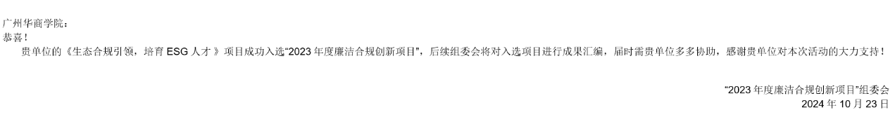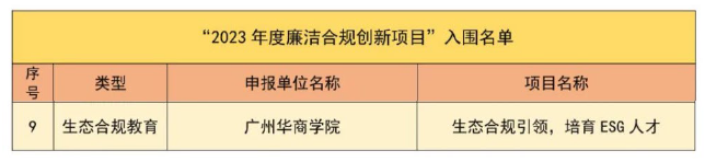 近日,yabo鸭脖官网ESG研究院联合华商教育集团精心打造的“生态合规引领 培养ESG人才”创新项目,在全省众多竞赛项目中脱颖而出,成功入围广东省2023年度廉洁合规创新项目,成为仅有的9项入围项目之一。这不仅是对鸭脖办学成果的肯定,更是对鸭脖ESG人才培养特色的高度认可!