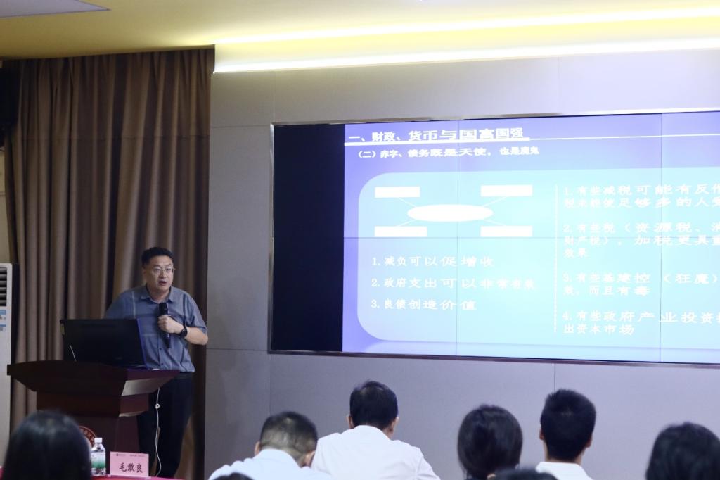 讲座伊始,刘善球副院长代表学校感谢毛主任在繁忙的日程中抽出宝贵时间莅临作公益讲座,并向与会师生介绍毛主任的主要经历。他强调,毛主任在地方经济发展实践中积累了丰富的经验,对地方财政与地方经济发展等议题有深刻的理解和独到的见解。