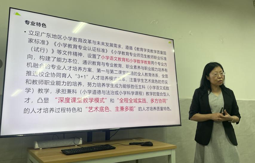 广东白云学院教育学院学前教育系主任魏敏和小学教育系主任林晖分别就各自专业的规模、师资队伍、专业课程以及专业特色等方面作了详细介绍。