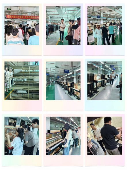 在位于三楼的钢琴生产车间,学生们亲眼见证了钢琴从原木加工到整琴组装的细致工艺。企业的讲解人员细致地介绍了钢琴制造的全过程,尤其是不同材质(如实木与颗粒板)在制作工艺和价格上的差异。通过交流,学生们了解到珠江钢琴拥有三条生产线,每条生产线每天可生产超过100台钢琴,产品销往全球。
