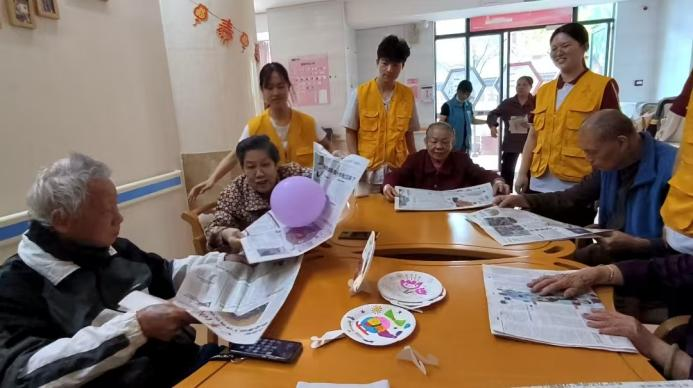 长者们围坐在一起,志愿者给每位长者分发一张报纸,随后志愿者随机将气球放在其中一位长者的报纸上,长者们手托报纸将气球送到另一位长者的报纸上,长者们在欢声笑语中进行传气球比赛。