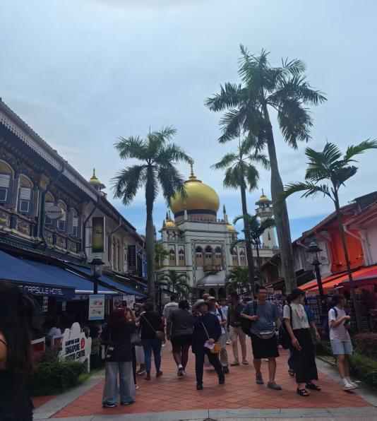 甘榜格南(Kampong Glam)是新加坡马来族群的历史发源地,也是多元文化交融的缩影。教师们走进苏丹回教堂(Sultan Mosque),这座建于1824年的清真寺以其金色穹顶与绿色釉砖闻名,穹顶边缘镶嵌的信徒捐赠玻璃瓶底马赛克,展现了社区凝聚力与朴素信仰。教堂讲解员详细介绍了伊斯兰建筑美学与宗教仪轨,教师们对“建筑即文化载体”的理念深有共鸣。