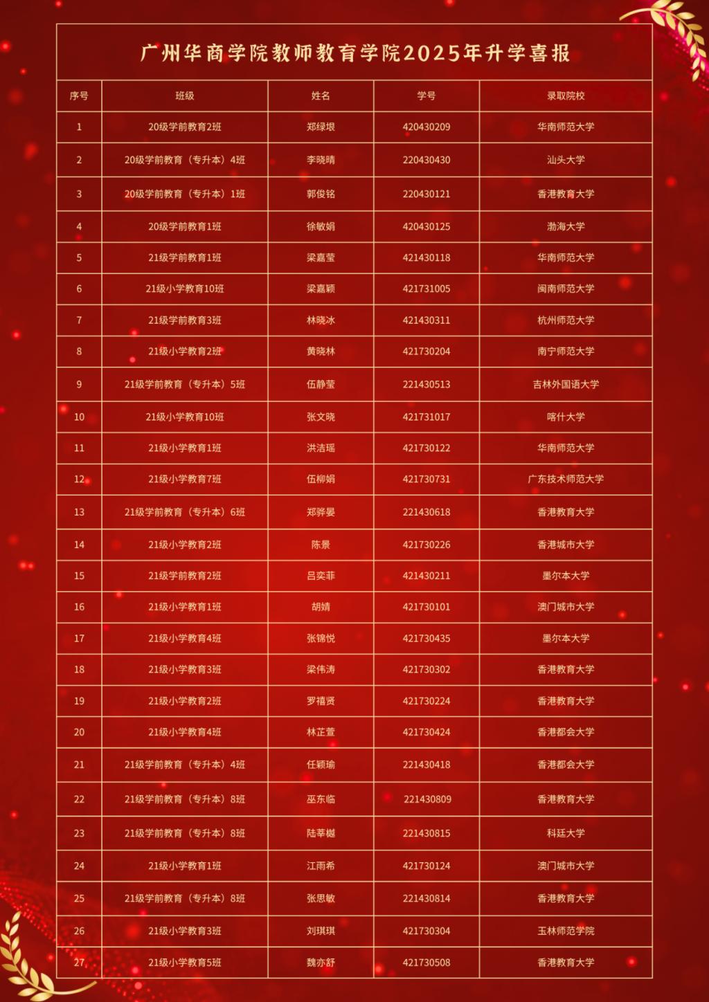 yabo鸭脖官网教师教育学院2025年毕业生考研再获佳绩。自建院以来,学院深耕学风建设,学子奋发向上。截至目前,教师教育学院2025届毕业生中共有27名同学被知名高校录取,特此向他们表示热烈祝贺!