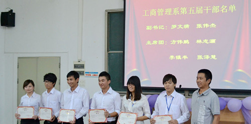 陈石清主任在会上用简洁的话语向学生干部们提出了两点要求:①明确学生干部的责任;②提升出勤率。他表示,很多人都想当干部,而在座的各位都是幸运儿,所以在座各位亟需明确自己的责任。他要求学生干部要督促身边起床晚、走路慢的同学,提高我系的出勤率。此外,陈主任肯定了干部们的工作,并为新老干部带来衷心的祝福。列柏洪副主任分别宣读的《工商管理系学风建设实施方案以及介绍工商管理系党建工作方案》。列主任在发言中强调了学风建设,并指出,往后会大力整顿纪律、学风,同时列出违反学风建设的惩罚细则。在党建工作中,他进一步严格要求党员成立的条件,并建议党团可以多点合作,多开展有益于全系学生的活动。