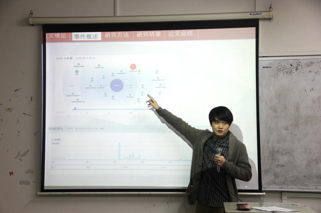 此次复赛内容为社会调查报告。每组选手对赛前抽选的社会热点事件进行调查,并在复赛现场通过幻灯片展示调查结果。本次复赛共有18支队伍参赛,评委由公共管理系专任教师杨剑老师和郑丽芬老师担任。比赛开始后,参赛者们胸有成竹,言辞犀利,对当下“旅游被坑——38元虾”、“90后总裁——大学生创业”和“肯德基秒杀门”等社会热点事件在大学生群体中的调查结果,进行分析、评论。评委老师耐心地对每组参赛者的报告做出点评,对他们的优点进行了肯定,对他们的不足之处提出了改进建议。参赛者的精彩报告难分伯仲,让场下观众也大呼过瘾的同时,也使比赛充满紧张和悬念。最终,经过两个小时的精彩论战,10支队脱颖而出,成功晋级下一轮的半决赛。