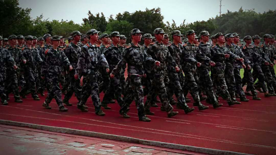 在训练开始前,教官对新生们的军服着装进行一番教育与调整。每位新生都以一副饱满的精神状态和认真至极的态度来应对严格的军事训练:站军姿——新生们必须站在原地不动20分钟以上;原地踏步,敬礼,齐步走等,都是军训中必不可少的科目。