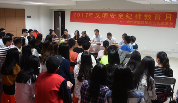 为了增强纪律观念和安全防范意识,强化会计学院班级管理和加强班级联系与合作,加快信息反馈效率,会计学院于4月11日至4月12日分别召开了14级、15级和16级班长联席会。会计学院副院长许娜、13级年级副主任陈洋广、14级年级副主任杨烨瀚、15级年级副主任童蓉、16级年级副主任叶颖瑜以及各年级辅导员参加了本次联席会。