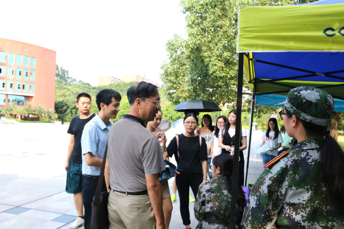 领导主任看到一些身体不适的新生同学后,停下脚步,对他们进行了详细的询问,了解他们的身体状况,交代他们军训要注意的事宜,特别注意防晒和能量补充。并及时与辅导员老师助班沟通,做到照顾他们的身体也要注意开导他们的情绪,让他们得到训练的同时也能感受到我系领导老师的保驾护航。我系主任老师的走访慰问极大地鼓舞了同学的士气,展现了我系领导老师亲切温暖的形象,诠释了为人师表的崇高责任感。