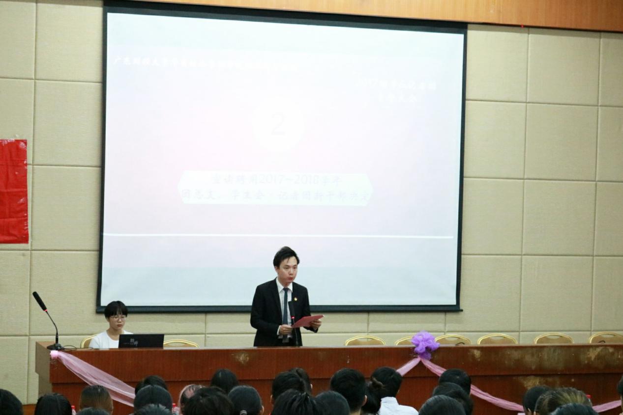 大会的第七项议程,是由学生会主席廖碧柔师姐介绍2017—2018学年新入职干部培训日程安排。团学•记制定的E路有你,精彩延续培训计划,目的是让新入职干部们更快更好地融入到工作中,提高干部们的服务意识和思想觉悟,培训干部工作能力,加强各干部干事们之间的团结合作精神,增加干部干事对部门的归属感。我们都是独一无二的,今后我系团总支•学生会•记者团将携手共创经济与金融系的新辉煌!