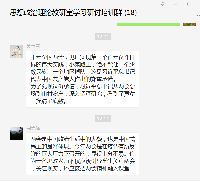 另外,教研室还组织教师在线交流“两会”精神学习体会,结合本职工作,聚焦“两会”热点,倾听主流声音,不断增强教书育人的责任感,自觉做好思想政治理论学习,积极投身教育实践。