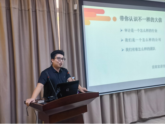 接下来,大信会计师事务所营总监蔡宝弘、项目经理邵磊、人事主管孙昕冉、人事经理王梦歌分别以“带你认识不一样的大信”、“如何做好审计实习工作”、“成为优秀的自己”、“怎样加入我们这个有趣的团队”为主题详细介绍了审计行业的发展趋势及大信会计师事务所的基本概况、业务类型、实习岗位职责、人员需求、企业文化、工资待遇、职业前景等内容。