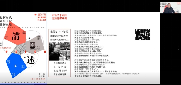 11月15日,传播与传媒学院网络与视频系邀请湖北美术学院叶佑天教授,开展主题为《“视觉新时代:设计为人民+锻铸新意境”》的学术讲座。视频系副主任戴金玲副教授是本次会议的主持人。因为疫情防控原因,本次讲座为线上形式,讲座总参与人数达到腾讯会议上限300人。