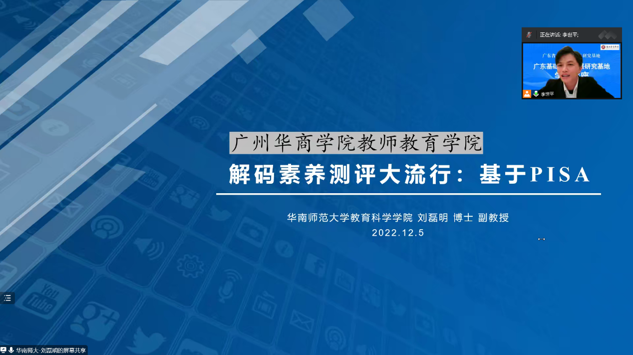 2022年12月5日,由教师教育学院主办的yabo鸭脖官网广东基础教育发展研究基地学术讲座正式开讲,本次讲座共两场。本场讲座的主讲为广东基础教育发展研究基地特聘教授——华南师范大学教育科学学院刘磊明副教授,主题为“解码素养大测评:基于PISA”。本场讲座由教师教育学院李世平老师主持。