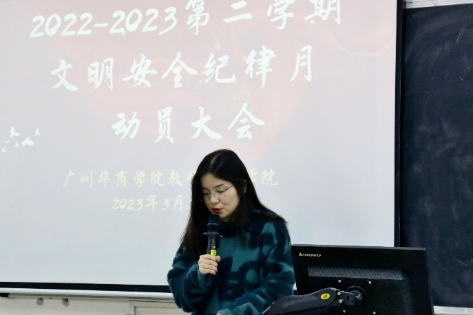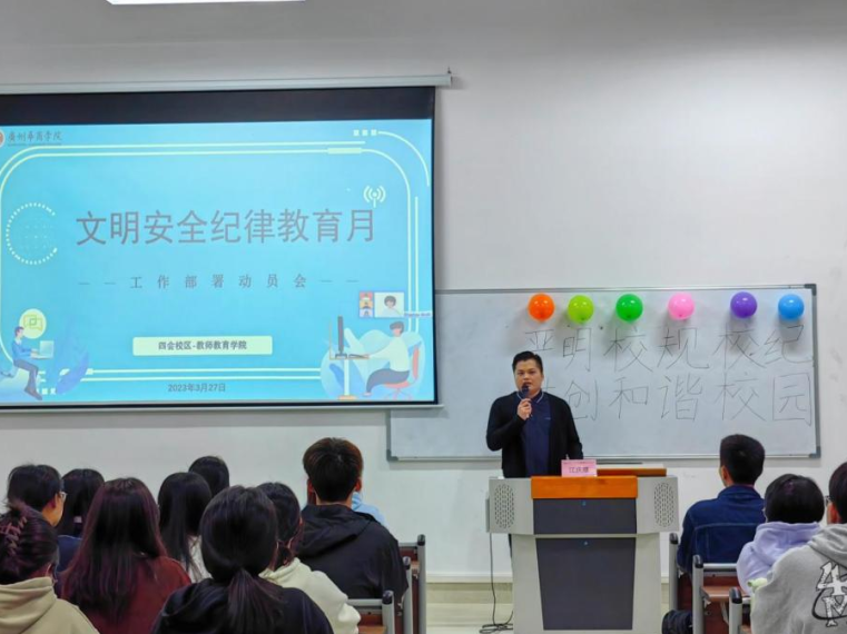 为响应鸭脖文明安全纪律教育月活动的号召,增强纪律意识和安全防范意识,营造一个安全、健康、和谐的校园环境。教师教育学院于3月27日在增城校区和四会校区开展了以“严明校规校纪,共创和谐校园”为主题的文明安全纪律教育月动员大会,教师教育学院全体辅导员和学生代表参加会议。