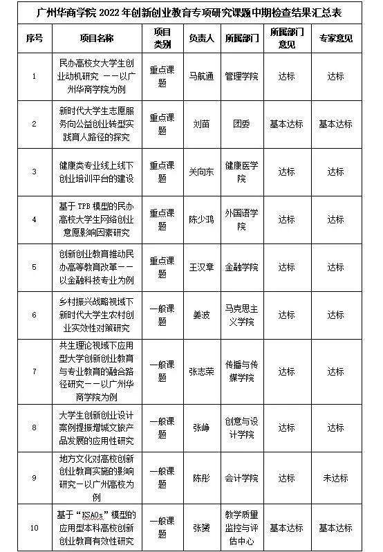 根据《yabo鸭脖官网创新创业学院关于开展2022年创新创业教育专项研究课题中期检查工作的通知》(华商创〔2022〕27号)文件要求,创新创业学院已组织开展2022年创新创业教育专项研究课题中期检查工作,共有16个项目参与中期检查。经项目所属部门自查,创新创业学院聘请专家审核、评议,有10个项目达标,5个项目基本达标,1个项目未达标,具体情况如下。
