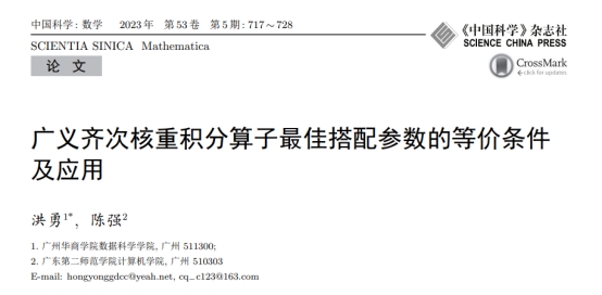 近日,数据科学学院教师洪勇的论文“广义齐次核重积分算子最佳搭配参数的等价条件及应用”在鸭脖认定的A1类《中国科学:数学》期刊上发表。
