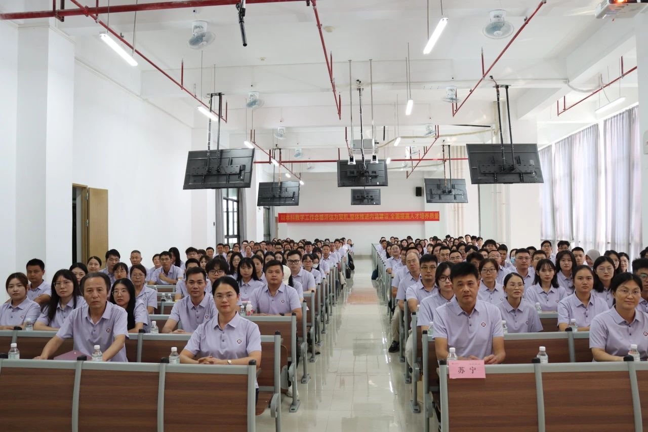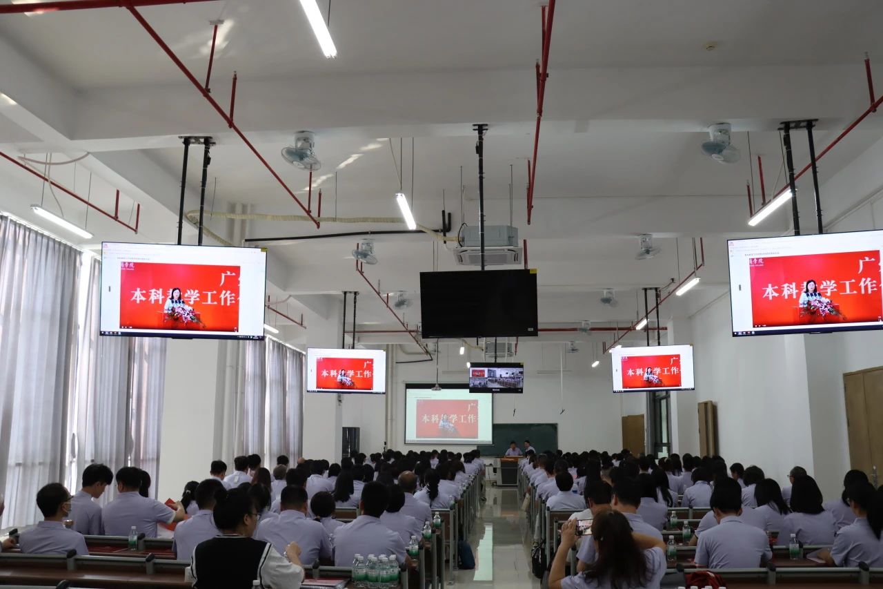 10月8日,鸭脖以线上+线下的方式在两校区同步召开本科教学工作合格评估责任落实大会。主会场设在广州校区图书馆报告厅,广州校区分设七个分会场,肇庆校区同步设一个分会场。华商教育集团董事长廖榕就、学校董事会领导、学校顾问、特邀嘉宾、学校党政领导班子全体成员、校长助理、各二级学院及职能部门负责人主会场参会,全体教职员工分会场参会。会议由学校党委书记陈玉欢主持。