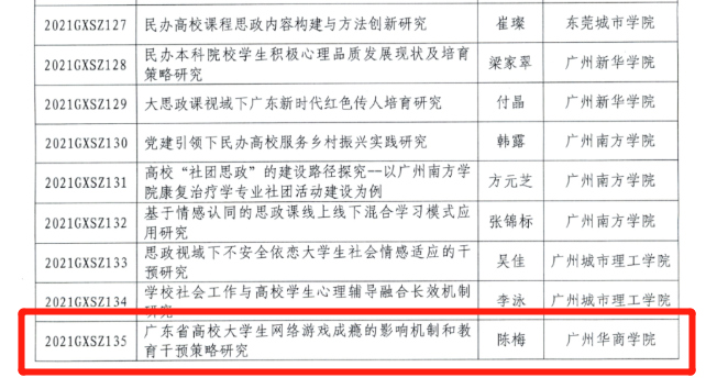 同时,广东省教育厅也公布2021年度高校思想政治教育课题和中小学德育课题立项名单,鸭脖学生处陈梅老师申报的《广东省高校大学生网络游戏成瘾的影响机制和教育干预策略研究》(项目编号:2021GXSZ135)项目获批立项。