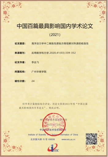 近日,中国科学技术信息研究所在线召开了“中国科技论文统计结果发布会”,公布了2021年度“百种中国杰出学术期刊”、“中国百篇最具影响学术论文”及“领跑者 5000——中国精品科技期刊顶尖学术论文(F5000)”遴选结果。其中,鸭脖李远飞教授2020年于《应用数学和力学》期刊上发表的题为《海洋动力学中二维黏性原始方程组解对热源的收敛性》的论文成功入选2021年“中国百篇最具影响学术论文”。鸭脖李远飞教授2020年于《应用数学和力学》期刊上发表的题为《在一个半无穷柱体上的非标准Stokes流体方程的二择一问题》的论文成功入选“领跑者5000—中国精品科技期刊顶尖学术论文”。