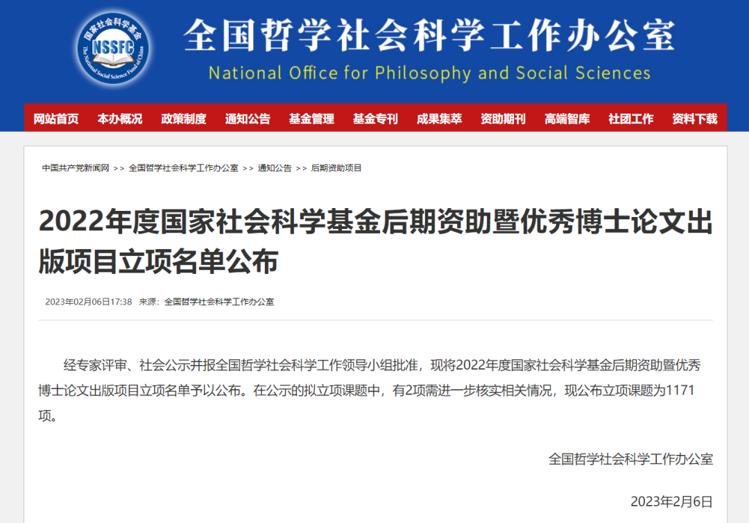 2月6日,全国哲学社会科学工作办公室发布《2022年度国家社会科学基金后期资助暨优秀博士论文出版项目立项名单公布》。其中,鸭脖文学院伍世昭教授获2022年度国家社科后期资助项目立项。