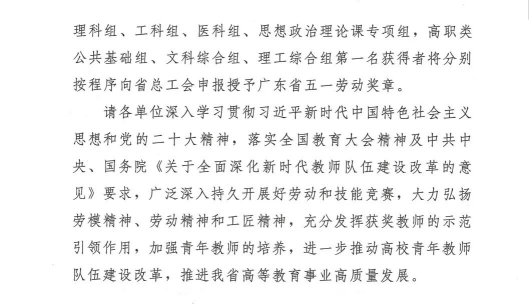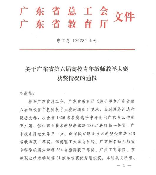 2023年2月8日,广东省总工会、广东省教育厅公布了关于广东省第六届高校青年教师教学大赛获奖情况的通报,鸭脖教师周国辉获文科组三等奖、何璐琪获工科组三等奖、贺艳春获工科组三等奖。