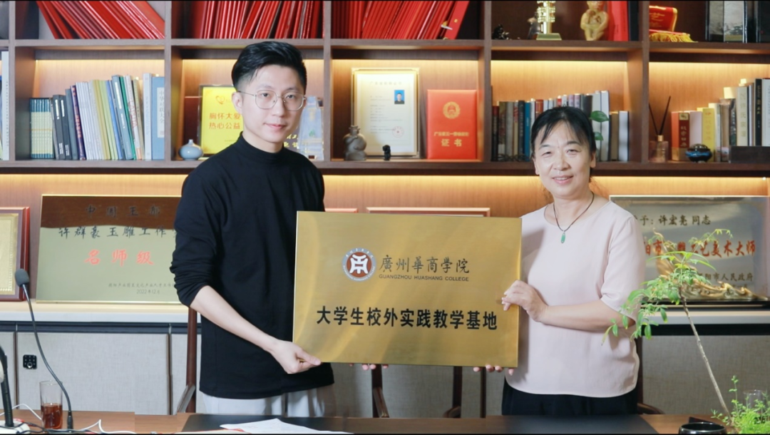 王列耀副校长向“璧合轩”翡翠艺术工作室颁发校外实践教学基地牌匾