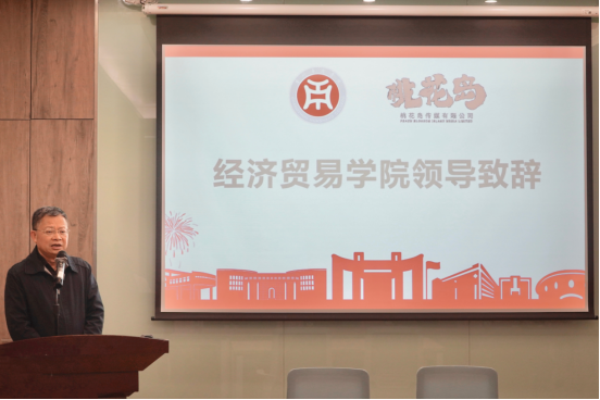 会议由经济贸易学院李广明院长主持,冯家裕副总经理和李广明院长对本次签约授牌仪式的成功举办表示祝贺并分别发言。冯家裕副总经理介绍了近期已启动的桃花岛与经济贸易学院的合作事项,并表示对双方产教融合的深化合作充满信心。