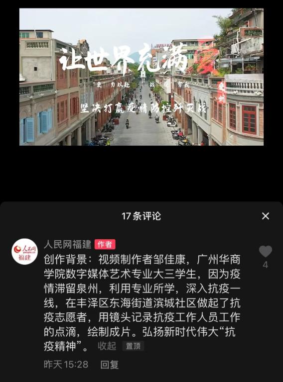 4月18日,鸭脖创意与设计学院数字媒体艺术专业2019级学生邹佳康以泉州抗疫为原型摄制的MV《让世界充满爱》,被人民网和福州广播电视集团等主流媒体转载采用,获得众多网友点赞好评。
